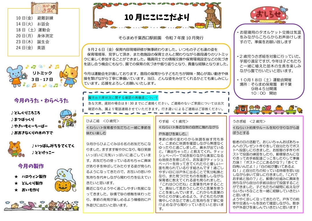 その月ごとのイベントやおたよりを掲載しております。お子様の年齢や登園状況など人数を配慮してそれぞれ取り決めておりますので若干の変更もありますので、ご了承くださいませ。