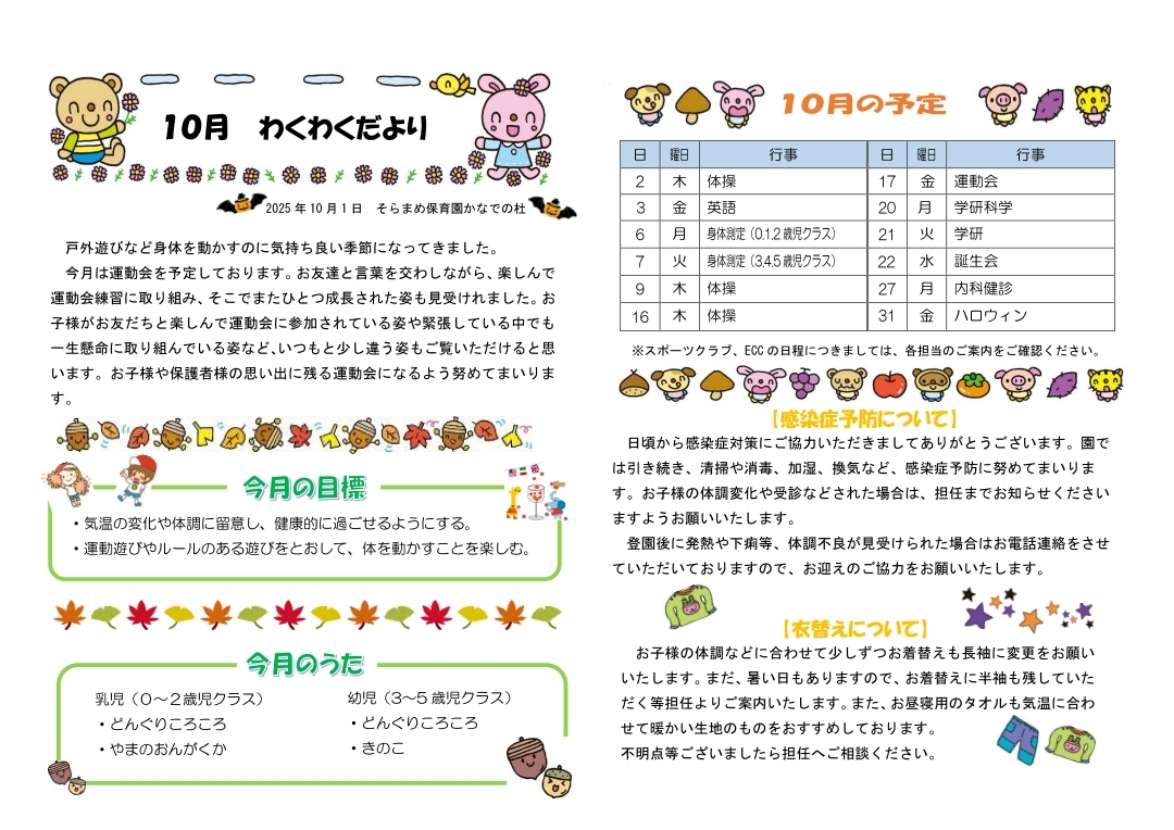 その月ごとのイベントやおたよりを掲載しております。お子様の年齢や登園状況など人数を配慮してそれぞれ取り決めておりますので若干の変更もありますので、ご了承くださいませ。