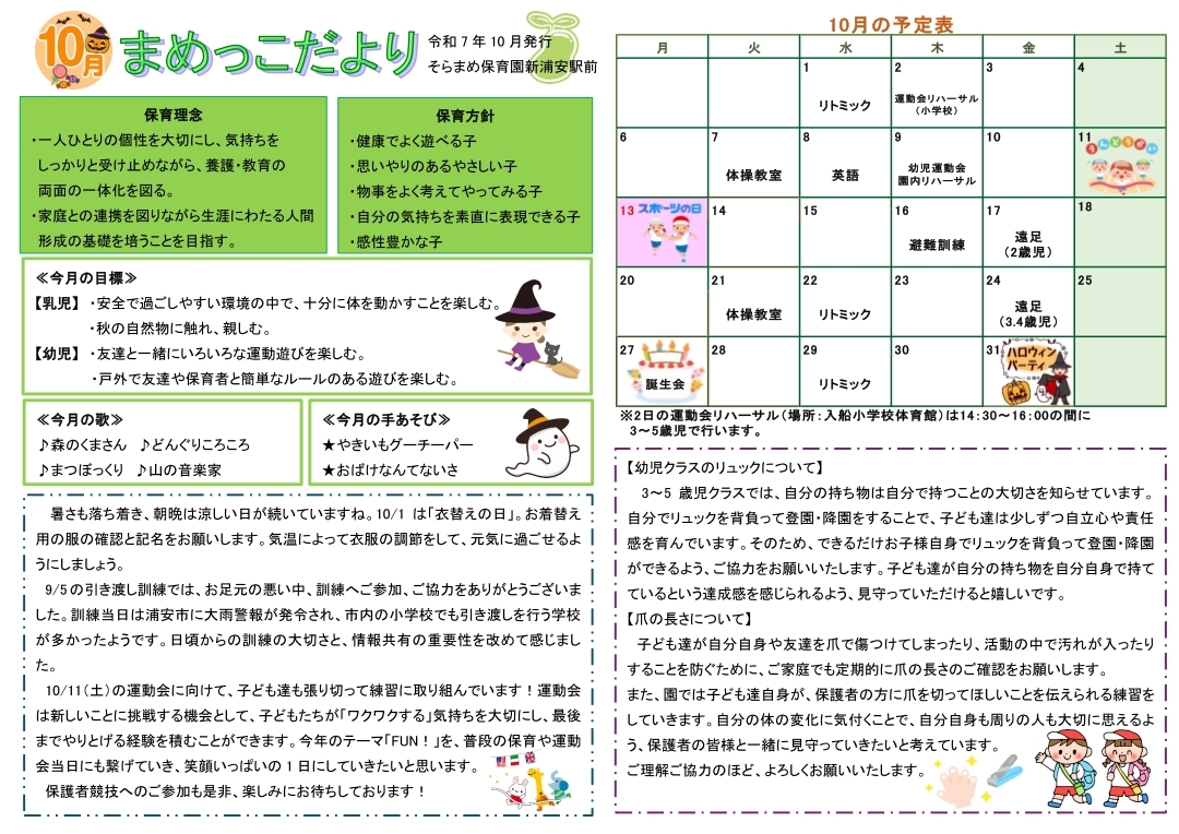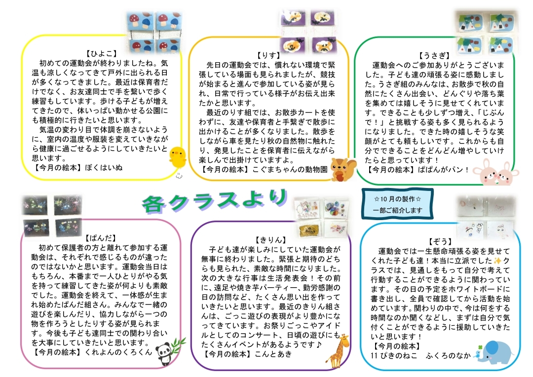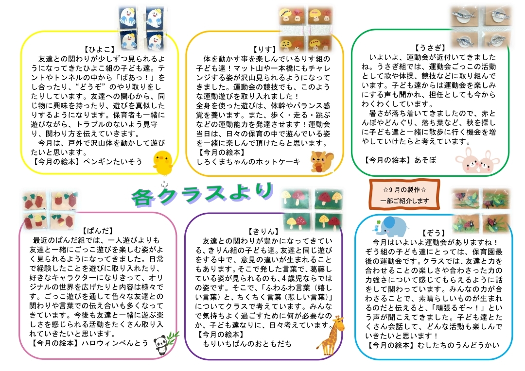 お子様の年齢や登園状況など人数を配慮してそれぞれ取り決めておりますので