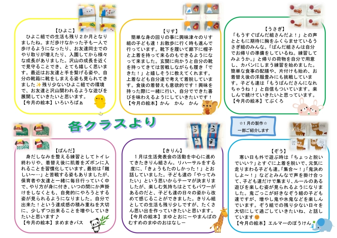 その月ごとのイベントやおたよりを掲載しております。お子様の年齢や登園状況など人数を配慮してそれぞれ取り決めておりますので若干の変更もありますので、ご了承くださいませ。