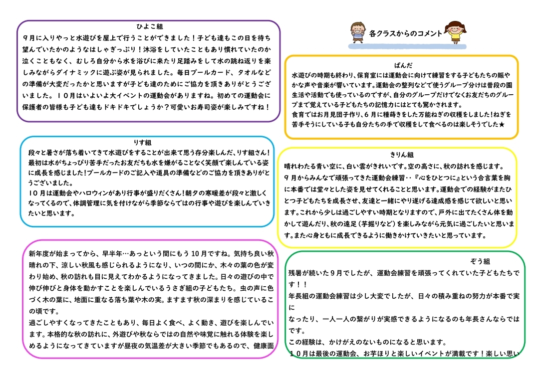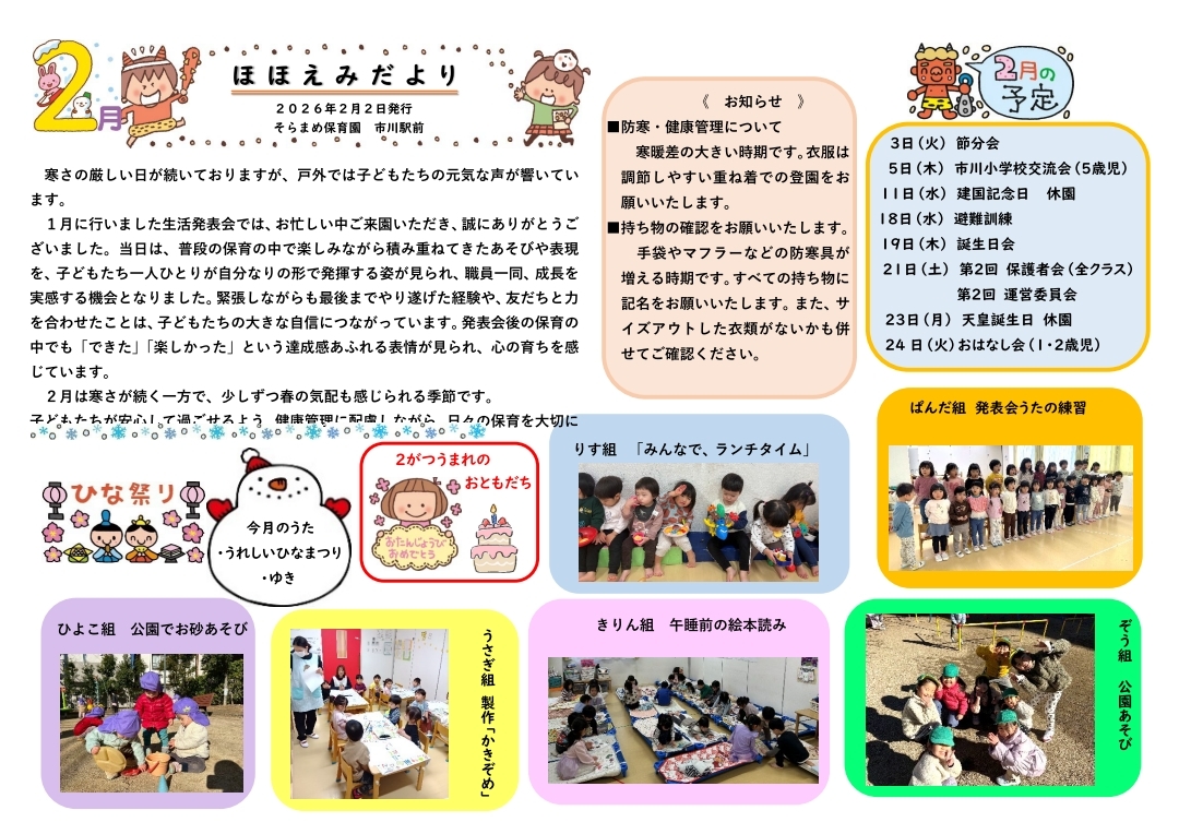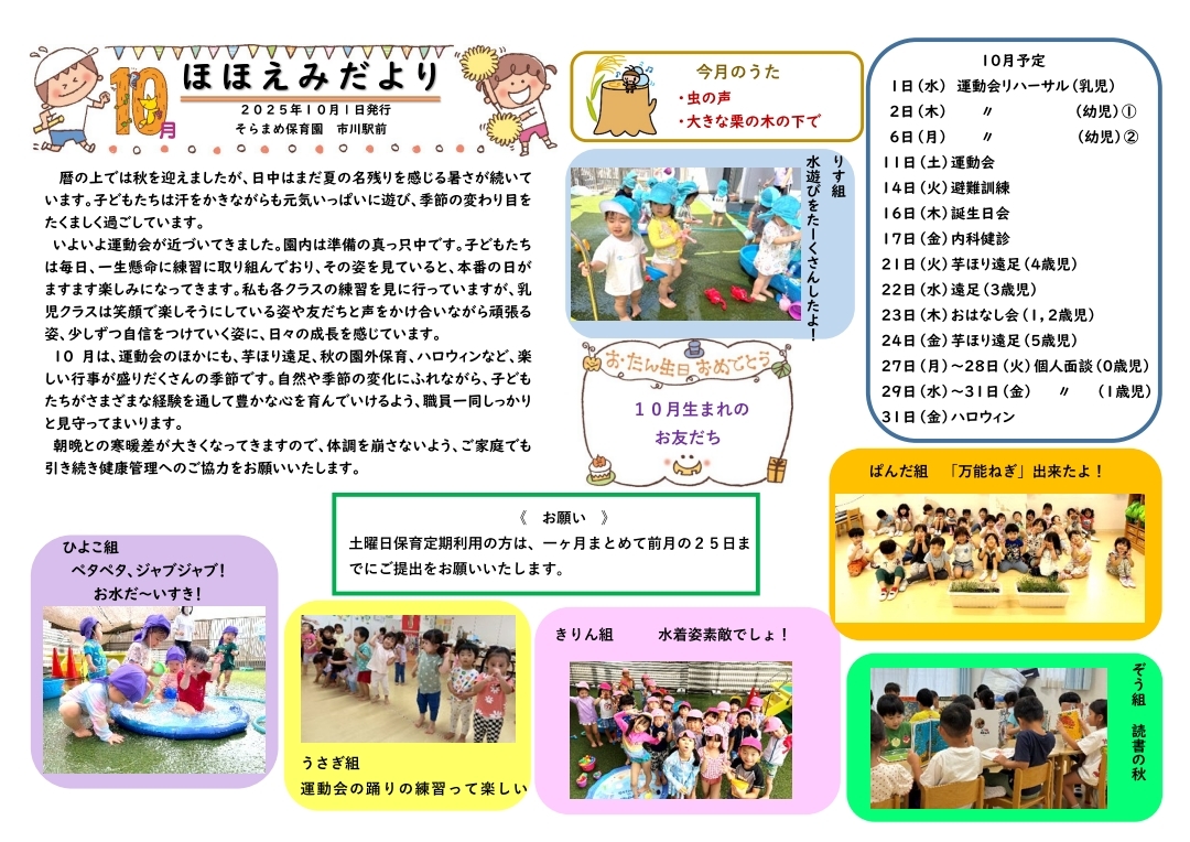 その月ごとのイベントやおたよりを掲載しております。お子様の年齢や登園状況など人数を配慮してそれぞれ取り決めておりますので若干の変更もありますので、ご了承くださいませ。