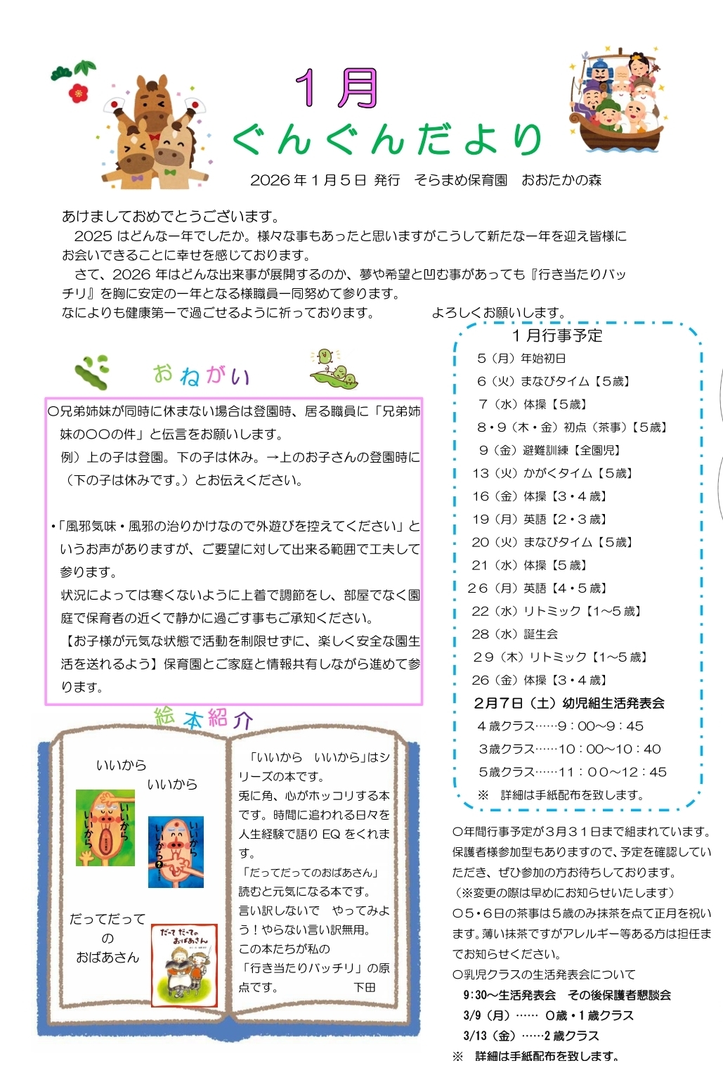 その月ごとのイベントやおたよりを掲載しております。お子様の年齢や登園状況など人数を配慮してそれぞれ取り決めておりますので若干の変更もありますので、ご了承くださいませ。