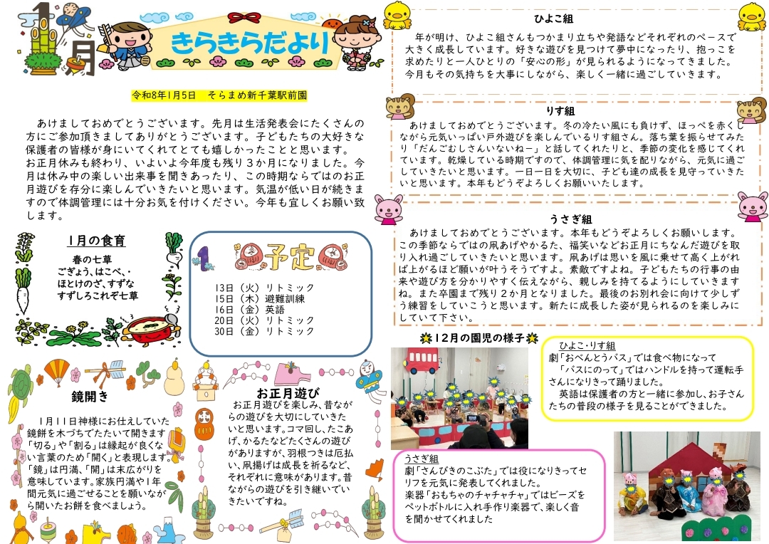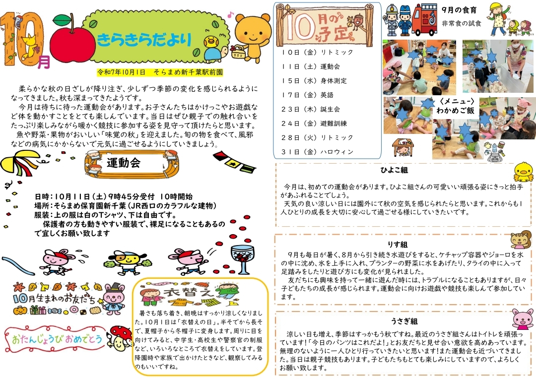 その月ごとのイベントやおたよりを掲載しております。お子様の年齢や登園状況など人数を配慮してそれぞれ取り決めておりますので若干の変更もありますので、ご了承くださいませ。