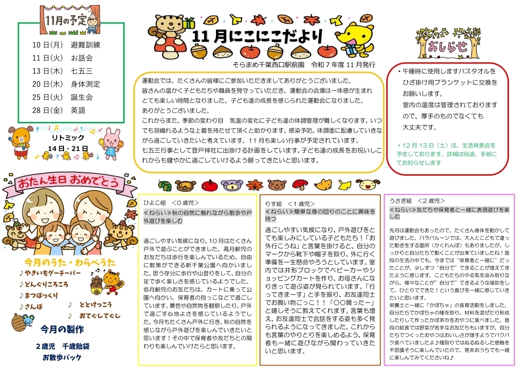 その月ごとのイベントやおたよりを掲載しております。お子様の年齢や登園状況など人数を配慮してそれぞれ取り決めておりますので若干の変更もありますので、ご了承くださいませ。