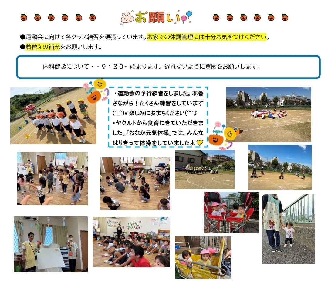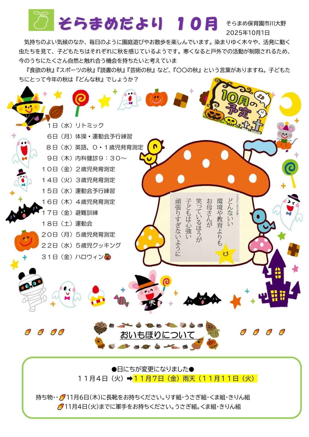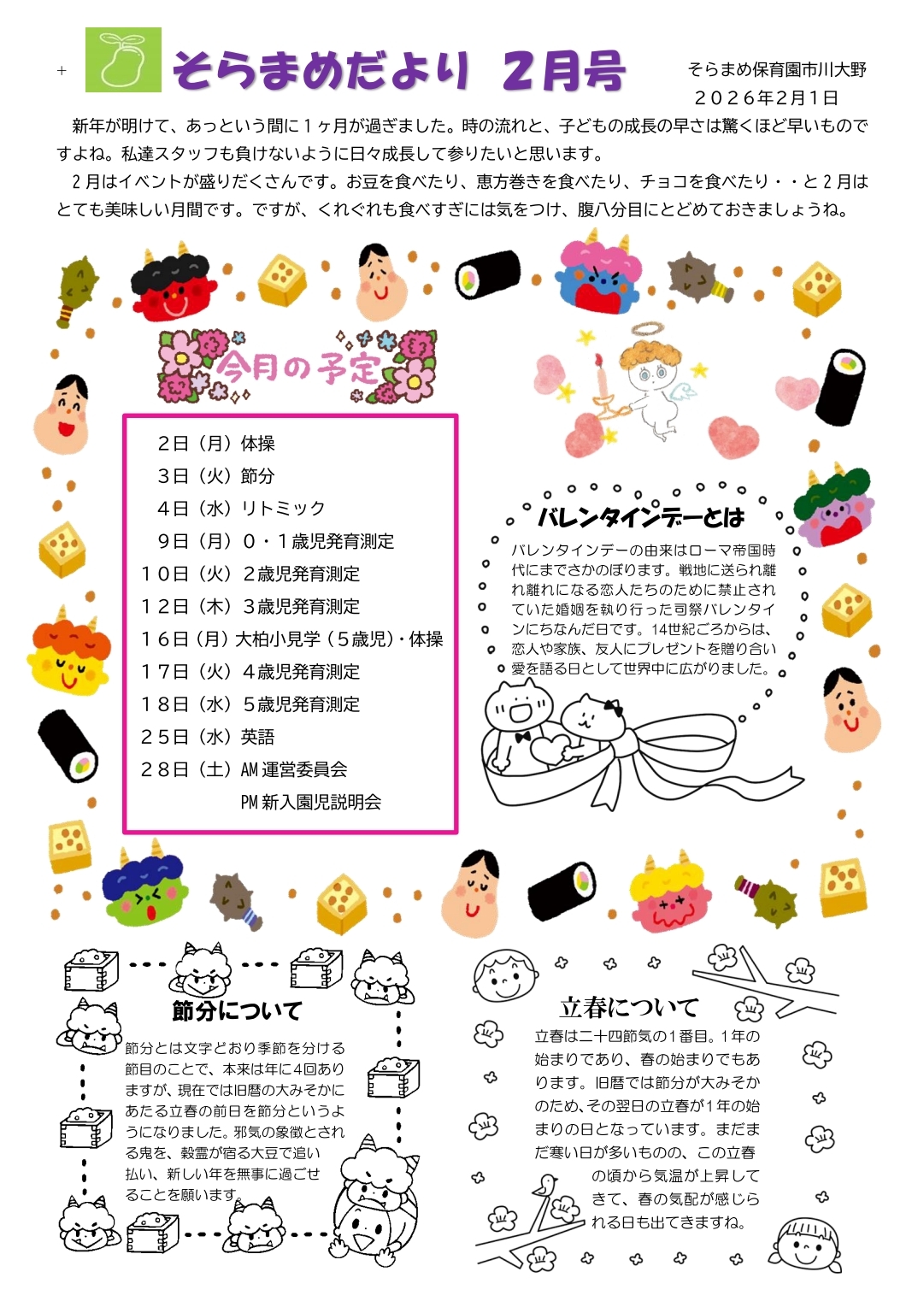 その月ごとのイベントやおたよりを掲載しております。お子様の年齢や登園状況など人数を配慮してそれぞれ取り決めておりますので若干の変更もありますので、ご了承くださいませ。
