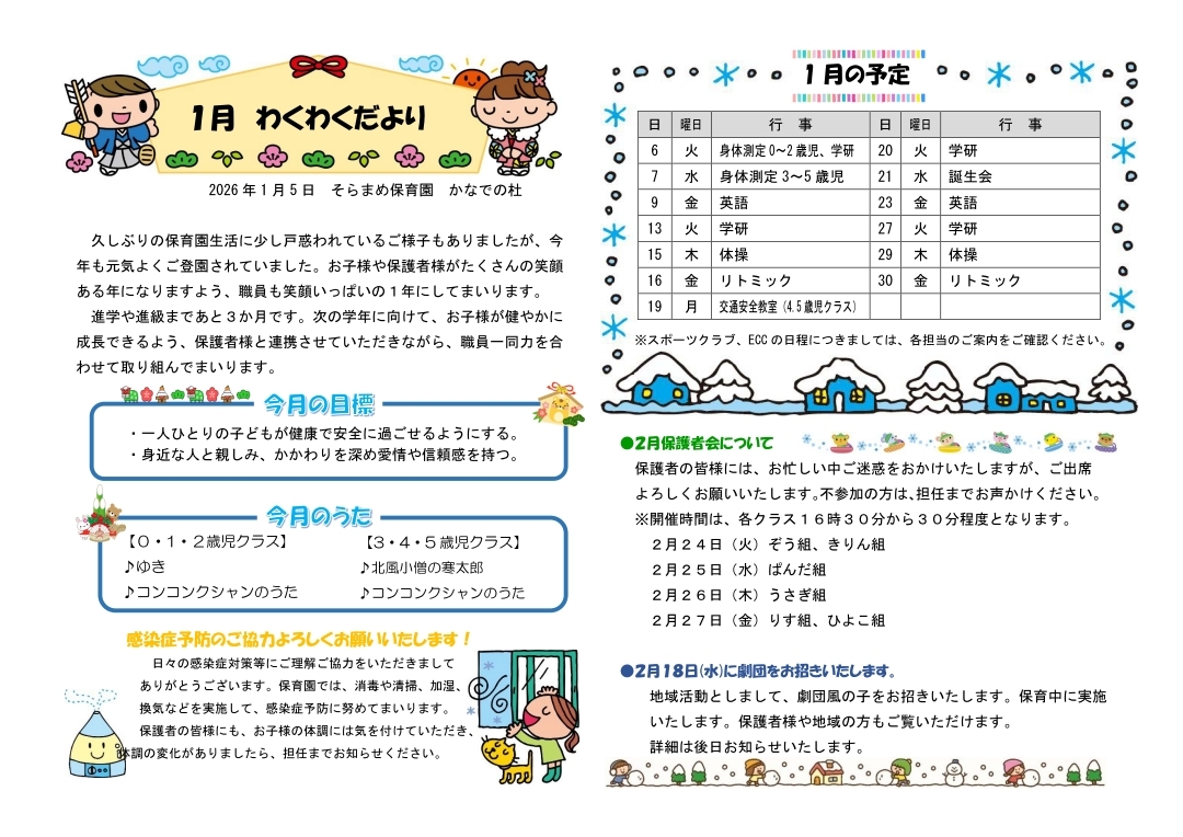 その月ごとのイベントやおたよりを掲載しております。お子様の年齢や登園状況など人数を配慮してそれぞれ取り決めておりますので若干の変更もありますので、ご了承くださいませ。