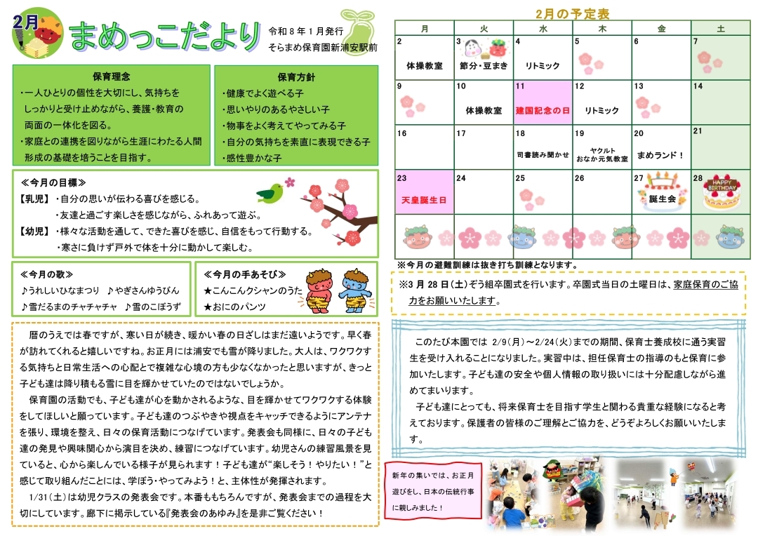その月ごとのイベントやおたよりを掲載しております。お子様の年齢や登園状況など人数を配慮してそれぞれ取り決めておりますので若干の変更もありますので、ご了承くださいませ。
