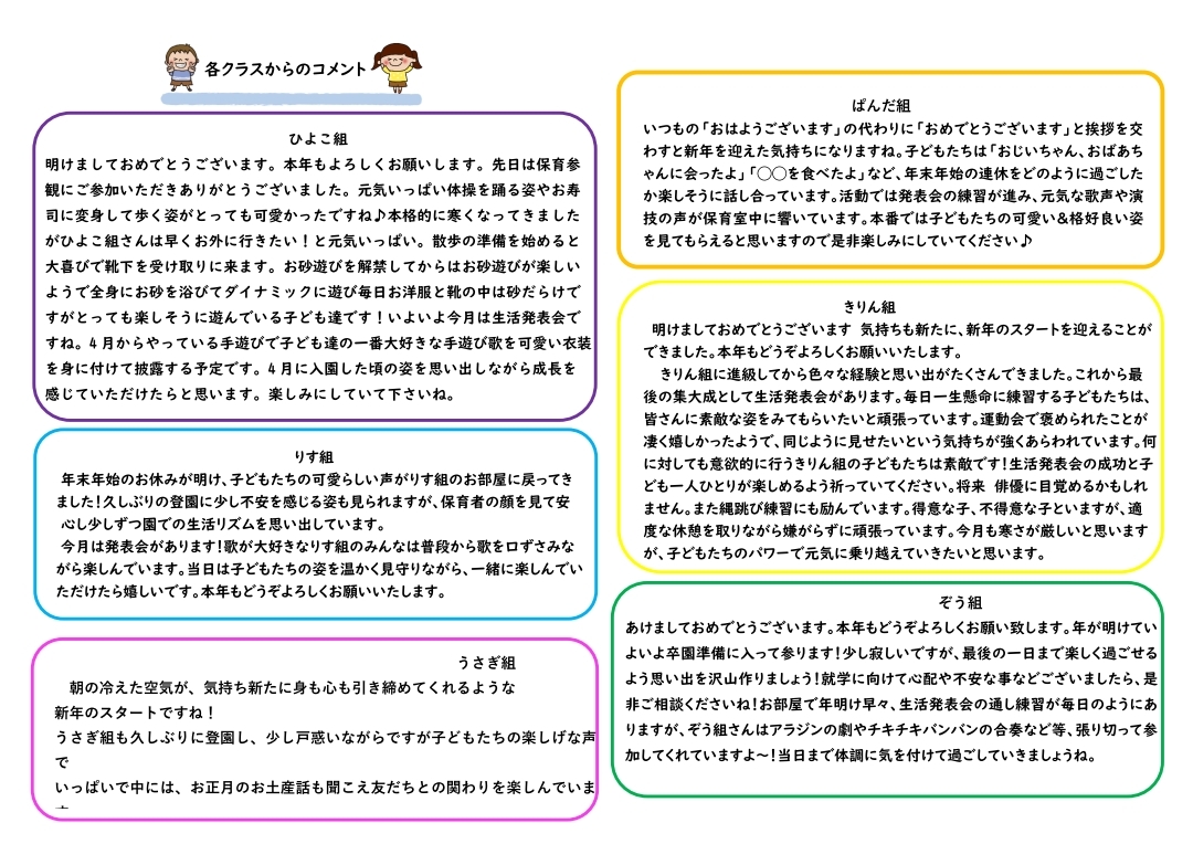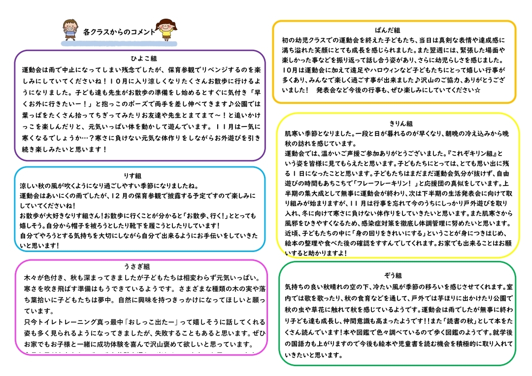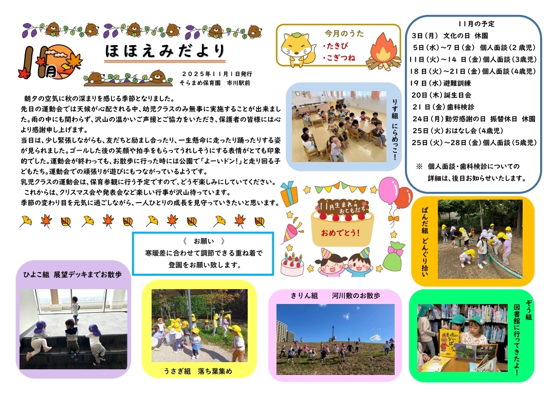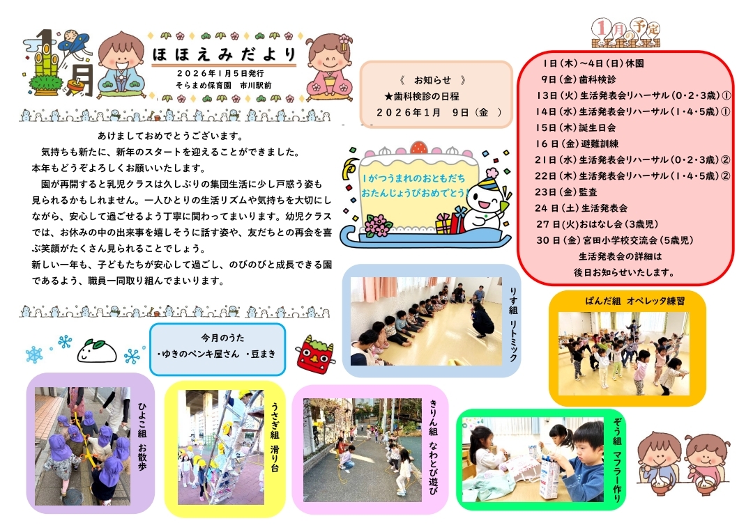 その月ごとのイベントやおたよりを掲載しております。お子様の年齢や登園状況など人数を配慮してそれぞれ取り決めておりますので若干の変更もありますので、ご了承くださいませ。