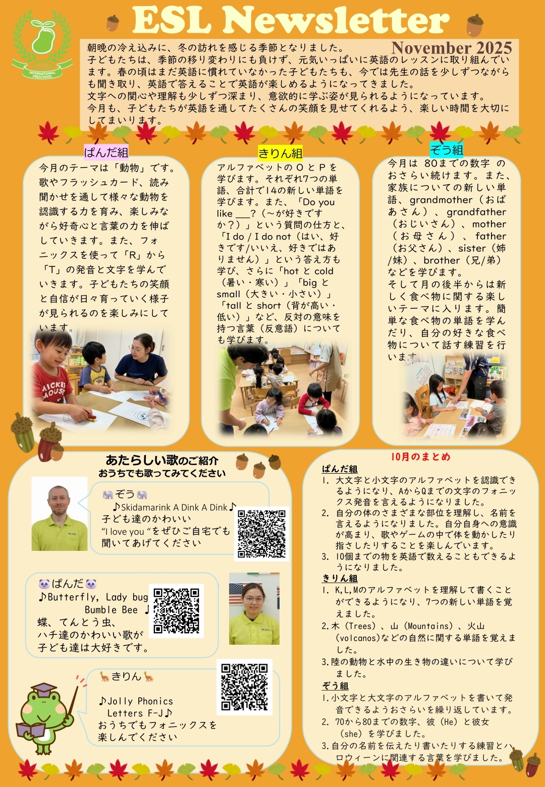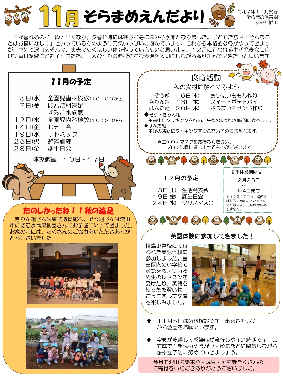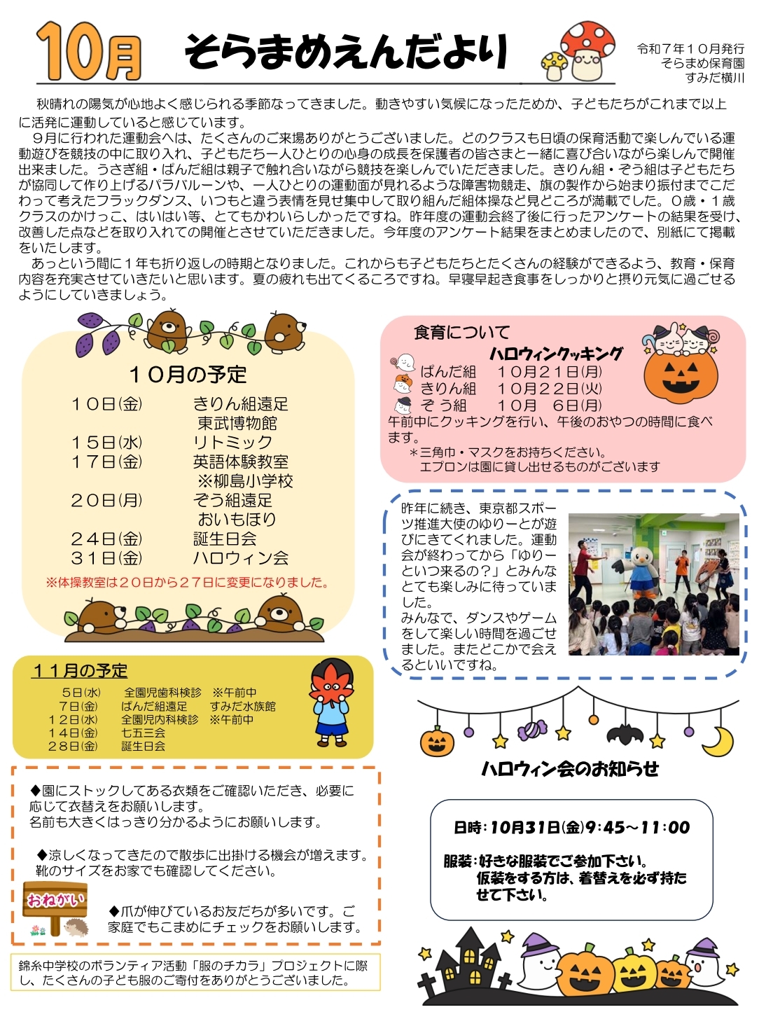 その月ごとのイベントやおたよりを掲載しております。お子様の年齢や登園状況など人数を配慮してそれぞれ取り決めておりますので若干の変更もありますので、ご了承くださいませ。