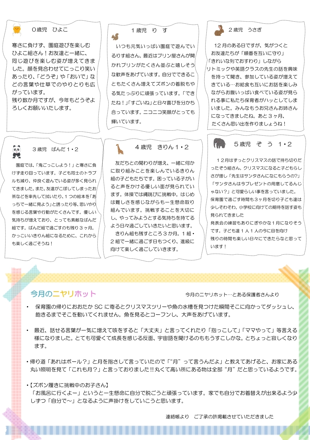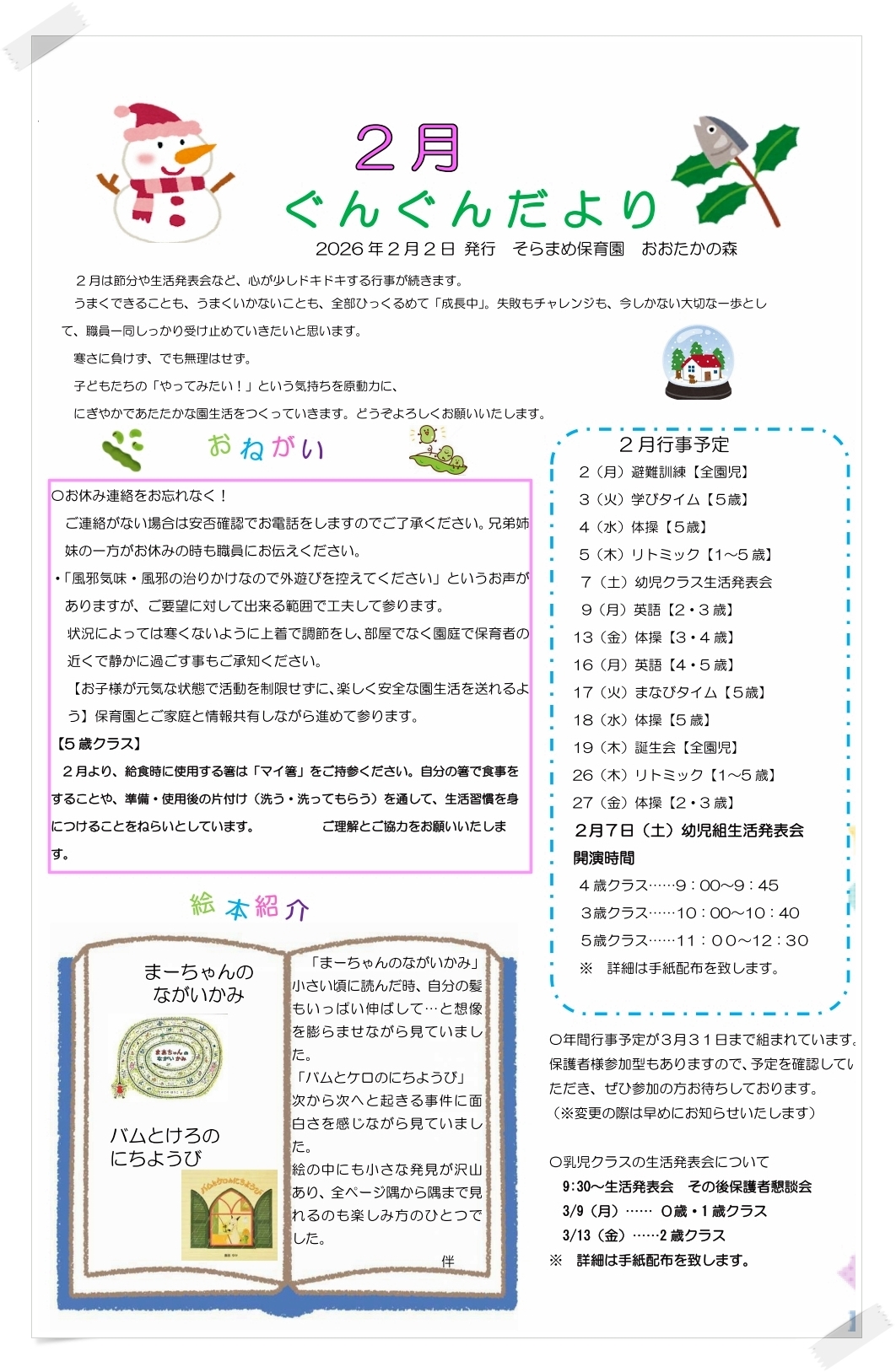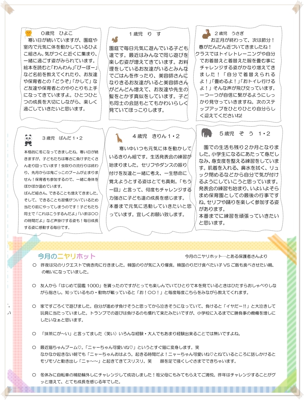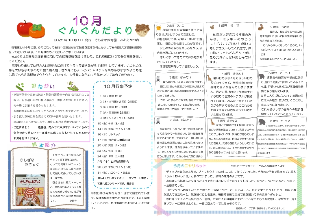 その月ごとのイベントやおたよりを掲載しております。お子様の年齢や登園状況など人数を配慮してそれぞれ取り決めておりますので若干の変更もありますので、ご了承くださいませ。