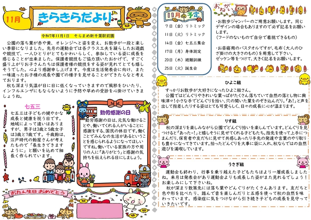 その月ごとのイベントやおたよりを掲載しております。お子様の年齢や登園状況など人数を配慮してそれぞれ取り決めておりますので若干の変更もありますので、ご了承くださいませ。